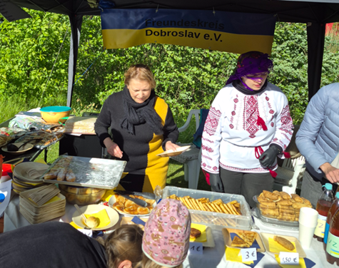 Wir hatten jeweils einen Stand, an dem typische ukrainische Leckereien, die von den Flüchtlingen liebevoll selbst von Hand zubereitet wurden, angeboten wurden. Natürlich durfte auch ukrainischer Wodka und selbstgemachtes Früchtekompott, Uzwar, nicht fehlen.